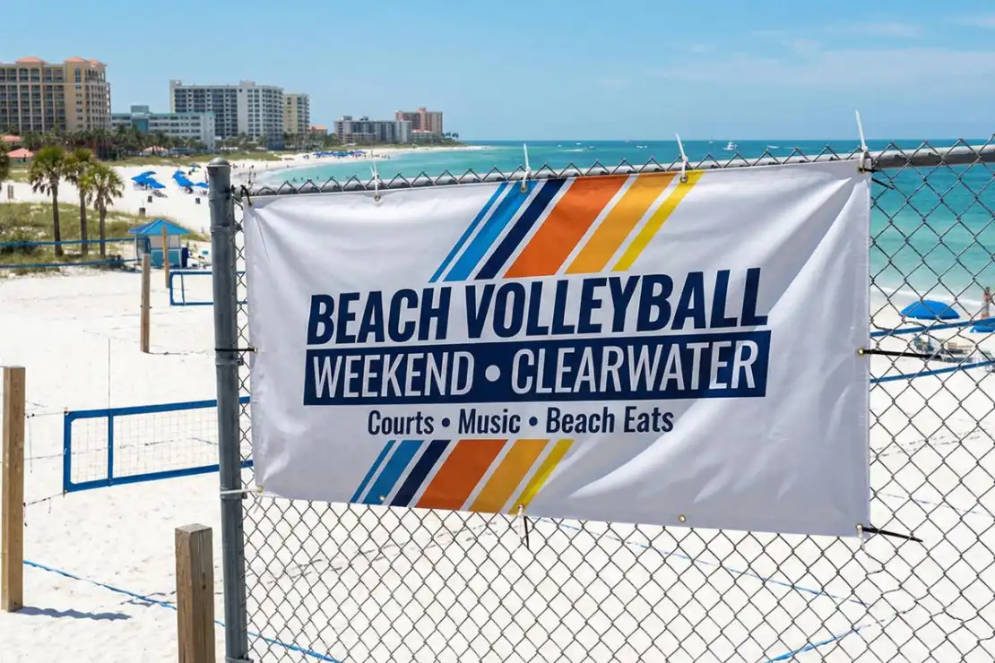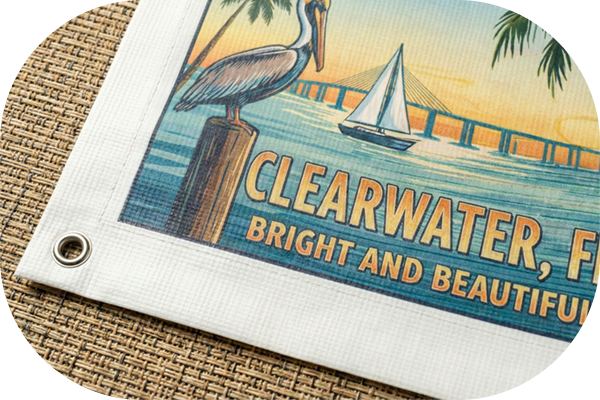 Our standard custom banners are printed on a robust 13oz scrim vinyl, engineered to withstand the salt air and intense sun of Clearwater Beach. This material relies on a polyester mesh core for tear resistance, sandwiched between layers of vinyl. The opaque white base ensures your banner graphics stay vibrant and readable by blocking out rear light sources, ensuring your message stands out clearly whether it’s displayed on the beach or downtown.