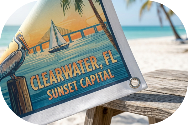 Capture the attention of locals and tourists alike with our professional vinyl Custom Banners Clearwater printing services. From the bustling Cleveland Street District to the sugar-sand shores of Clearwater Beach, your business needs Clearwater advertising banners that stand up to the elements while looking sharp. We utilize large-format printing technology with premium resin and UV-cured inks on heavy-duty 13oz vinyl. This ensures your custom signage remains vibrant and fade-resistant, even against the intense UV rays and salt air common along the Gulf Coast.