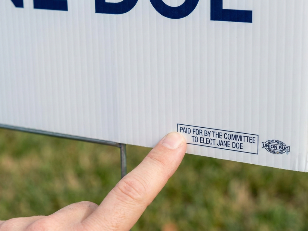 Political printing is legally distinct from printing a menu or a birthday banner. There are strict laws regarding disclaimers, union bugs, and financial reporting.