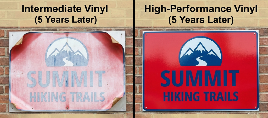 - The Why: Intermediate vinyl typically lasts 2-4 years outdoors before it begins to shrink or fade significantly. High-performance vinyl is engineered to last 7-9 years, maintaining its gloss and color integrity despite UV exposure.