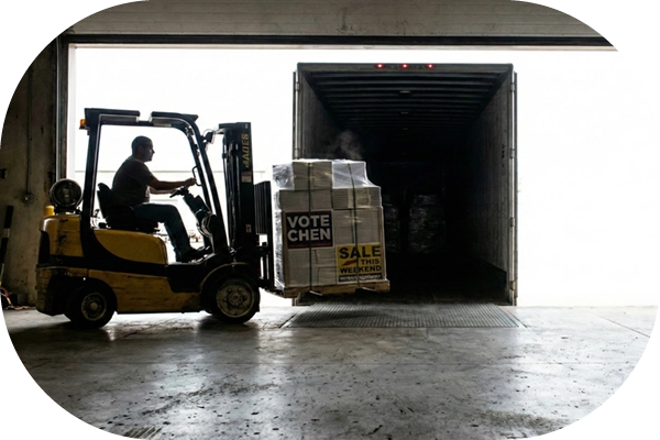 Did you know a single semi-trailer can hold 24 pallets, totaling 66,000 standard 18” x 24” yard signs? We strictly cap our loads at this limit to ensure safety and prevent damage during transit. Alternately, a semi can accommodate 33,000 signs with accompanying stakes. We know these configurations inside and out because we ship them frequently. All bulk pallets are bundled and stacked for maximum stability and ease of unloading. For smaller runs, we also offer UPS shipping for orders of up to 1,000 signs and stakes.