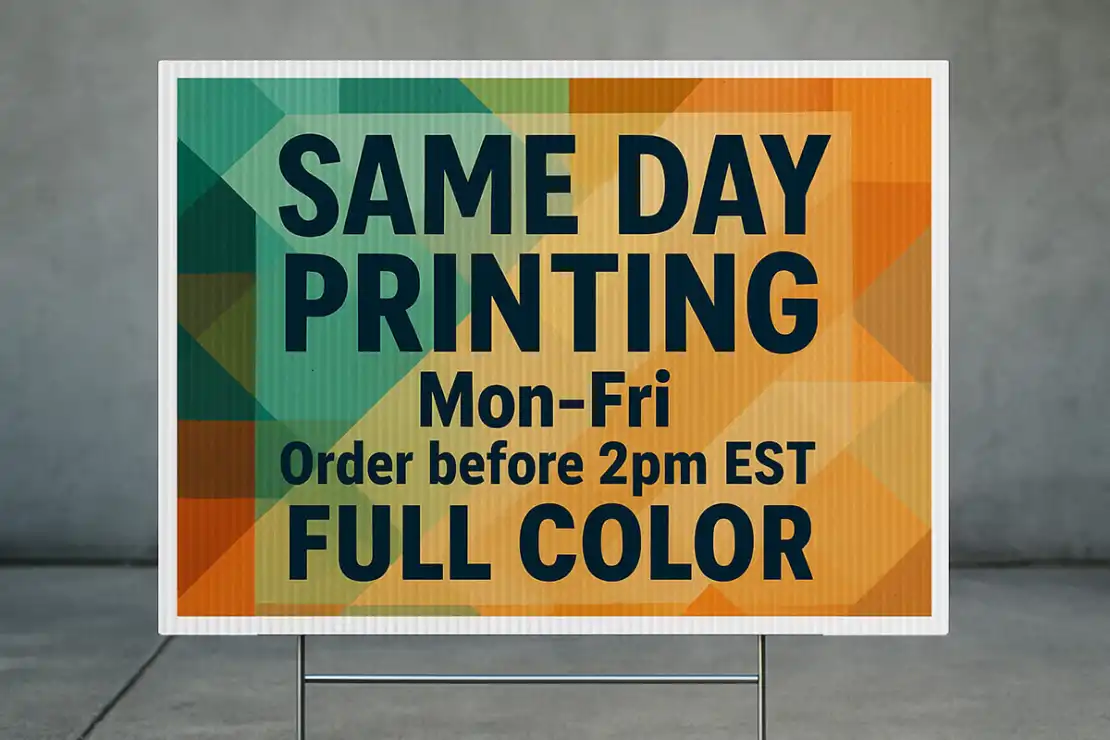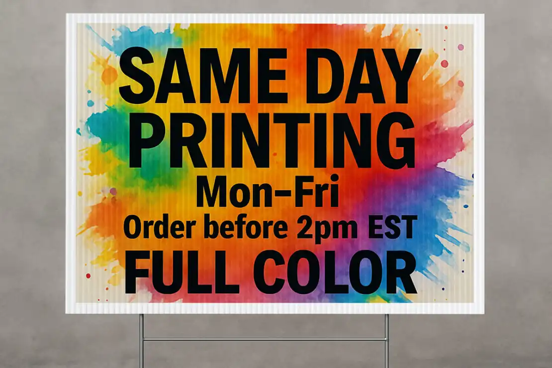 Need your signs fast? We've got you covered. Our Same Day Yard Signs are perfect for last-minute events, promotions, real estate listings, political campaigns, and anything else that can't wait. Place your order before 2pm EST, and we'll print and ship your signs the same day! Combine same day printing with expedited shipping and you can receive your order in as little as 1 business day! In store pick up is also available in Tampa, FL. All orders placed after 2pm EST Monday through Friday will be scheduled for the next business day. We print in full color on durable corrugated plastic using high-quality inks for long-lasting outdoor performance. Signs are available in multiples of 10 only with a maximum quantity of 150.
