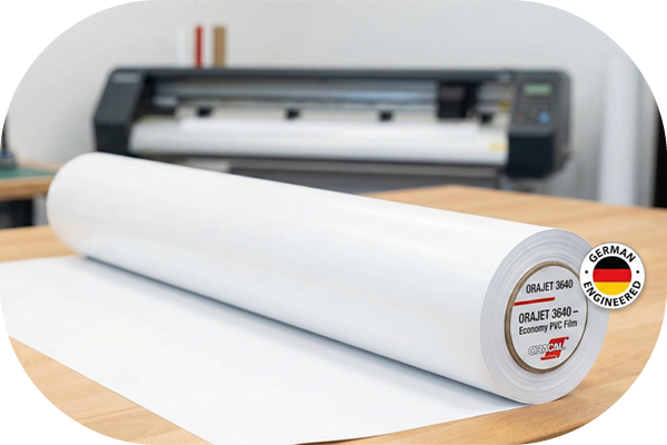 Oracal’s Orajet 3640 is a 3-mil-thick white PVC vinyl for short- to medium-term applications. It is German-engineered for consistency of printing and cutting, and it is the best economy vinyl we’ve ever found. The backing paper, aka “Release Liner,” is 83# silicone-coated paper.