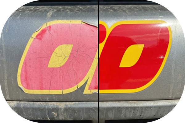 Outdoor life refers to both how long before ink fade occurs, and also how long before cracking or shrinking could occur. Oracal’s Orajet 3640 lasts 1+ years outside if not laminated before fading sets in. With an economy UV-resistant laminate, this goes to 2 years+. Shrinkage of Oracal 3640 begins likewise at 1 year unlaminated. With lamination, shrinkage is not discernible until 18 months to 2 years.