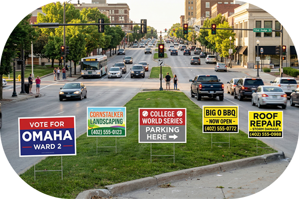 With thousands of commuters navigating Dodge Street and I-80 daily, your signage has to pop. We specialize in high-visibility designs that use bold, high-contrast colors and clean typography to ensure your message is legible at a glance. By elevating your brand to eye level on a rigid metal H-stake, we help you cut through the visual noise of the city, making your business or campaign the most memorable landmark in the neighborhood.