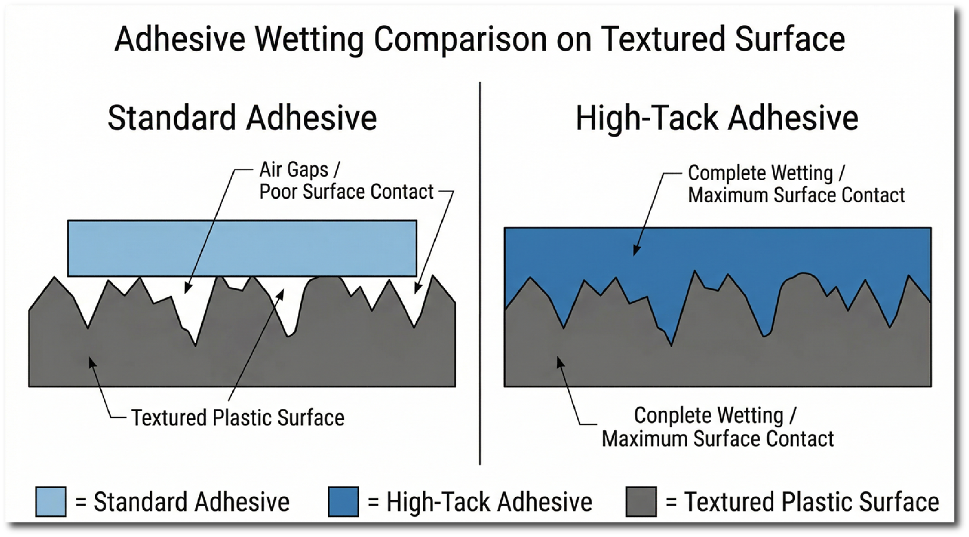 Standard adhesives tend to bead up on slick plastics, but high-tack adhesives flow into the surface, creating a stronger bond that resists peeling. On LSE plastics, standard adhesives never fully “wet out,” which is why they fail even when applied correctly.