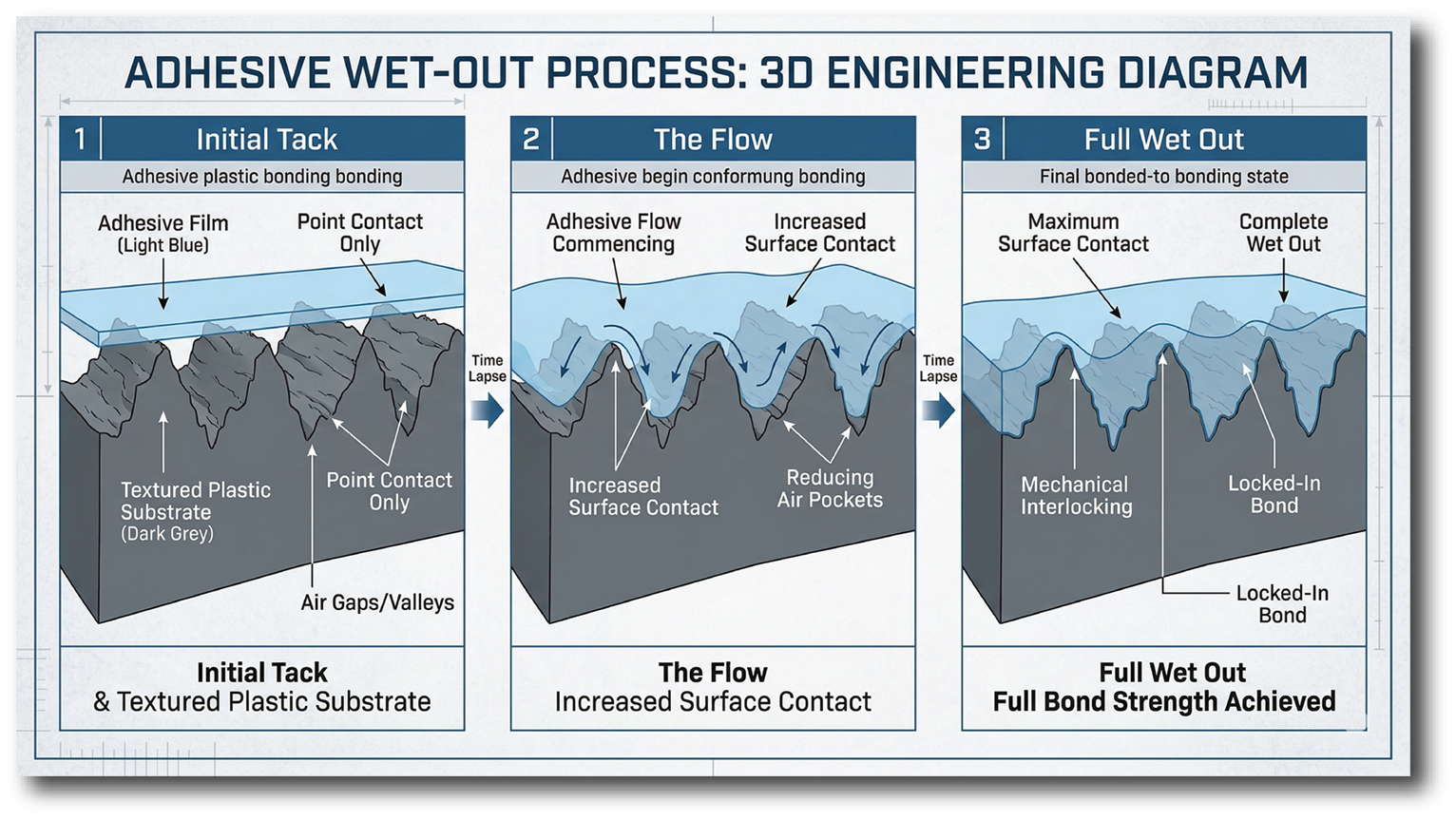 Think of adhesive "wet out" like spreading cold butter on toast. When you first drop a piece of butter on the bread, it's just sitting on top. It's "stuck," but you could easily flick it off with a finger. Wet out is what happens when that butter starts to melt and soak into all the tiny nooks and crannies of the toast.