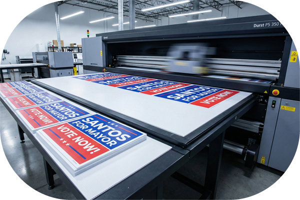 We print directly onto industry-leading 4mm Coroplast® using state-of-the-art Durst printers. These machines utilize premium UV-cured inks that instantly bond to the corrugated plastic, creating a durable advertising sign with a sophisticated matte finish. This finish minimizes glare in bright sunlight, ensuring your plastic yard signs remain readable from the street. Whether you need a single custom sign or a bulk order, digital printing offers professional quality without the setup fees of screen printing.