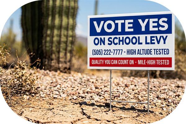 Running a winning campaign in the Duke City means your advertising has to survive intense high-desert UV rays and strong spring winds. Our heavy-duty Albuquerque Political Yard Signs are built specifically to handle the extreme conditions of the 505 area code. Manufactured from rugged 4mm Coroplast®, these waterproof campaign signs guarantee your name won't fade into the background, whether you are canvassing local neighborhoods or building grassroots support across Bernalillo County.
