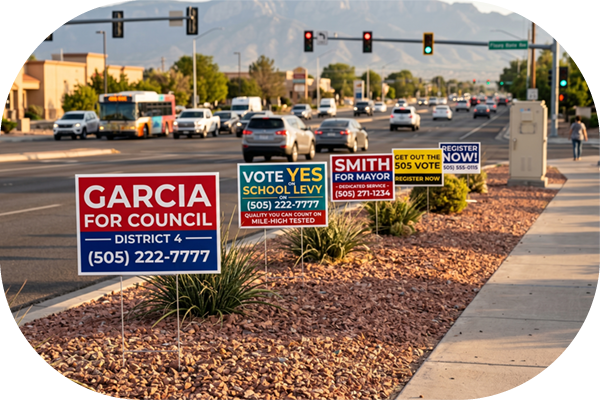 Winning over Albuquerque voters requires an undeniable, ground-level physical presence in a city driven by daily commutes. Staking custom political signs at high-traffic intersections along Montgomery Blvd or Paseo del Norte, or proudly lining the lawns of dedicated supporters in neighborhoods like the South Valley, builds critical, unavoidable name recognition. By turning sprawling medians, community block walls, and front yards into your 24/7 grassroots advertising network, you create a tangible momentum that cuts through the noise of the political machine.
