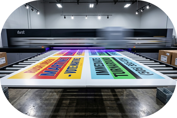 - Digital Printing: When your race requires full-color candidate portraits or just a smaller run of cheap yard signs, our state-of-the-art Durst P5 350HS production lines deliver. This process applies the ink flawlessly to the plastic yard signs, ensuring a crisp, glare-free matte finish.