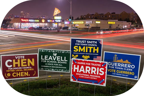 We tailor our printing methods to your exact outreach needs. Choose the production style that best aligns with your affordable political lawn signs: