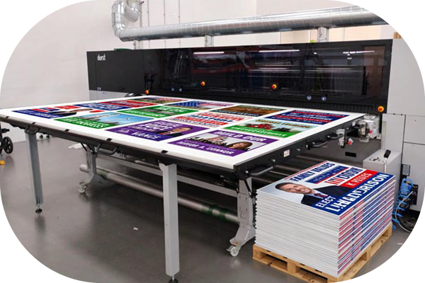 - Digital Printing: When your race calls for stunning full-color candidate portraits, detailed layouts, or just a short run of affordable yard signs, we fire up our state-of-the-art Durst P5 350HS flatbed printer. This advanced system cures the ink directly onto the corrugated plastic, yielding a premium, clean, and glare-free matte finish.