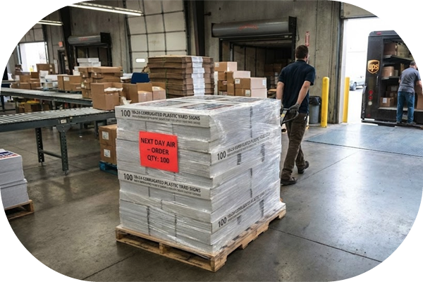 Great pricing shouldn’t be ruined by hidden shipping costs. We offer Free Ground Shipping on all orders over $89 via UPS, bringing value directly to your door anywhere in the country. Need massive highway signs? We have the logistics to handle it. Signs larger than 48” x 32” can be scored and folded for free shipping, or we can coordinate palletized freight delivery for large-scale flat shipments.