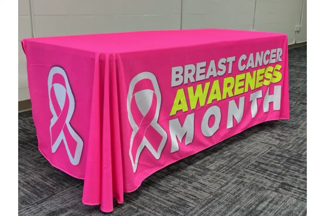 Our Laguna brand Premium warp-knitted polyester fabric is perfect for all-over custom-made printed promotional tablecloths. The bright white point of this fabric lets colors truly pop. Fast, affordable promotional table covers for your event, with the quality the U.S. has come to expect at Good Guys Signs. A 3-sided tablecloth covers the front and two sides of your table, with the back left open for easy access for storage or seating. Ideal for trade shows and events, it offers a polished look from the front while keeping your materials within reach.