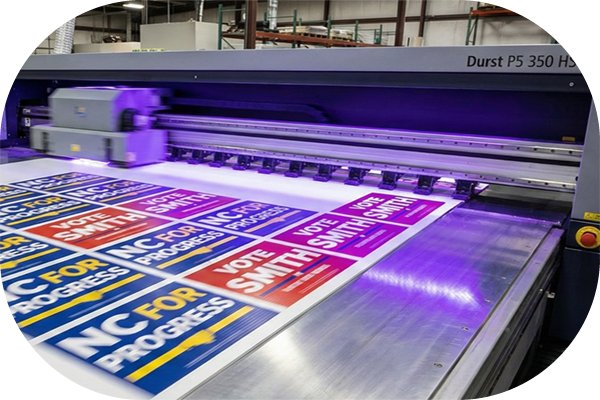 North Carolina political campaigns move fast, and responding to a developing narrative requires reliable print turnaround. We offer versatile production methods to eliminate manufacturing bottlenecks. For full-color designs, our Durst P5 350 HS flatbed printer prints graphics directly onto corrugated plastic with instant UV curing. For massive runs of classic 1- and 2-color designs, our high-speed screen printing presses deliver unmatched efficiency. Your election signs move rapidly from the print floor to their wire H-stakes to meet urgent campaign deadlines.