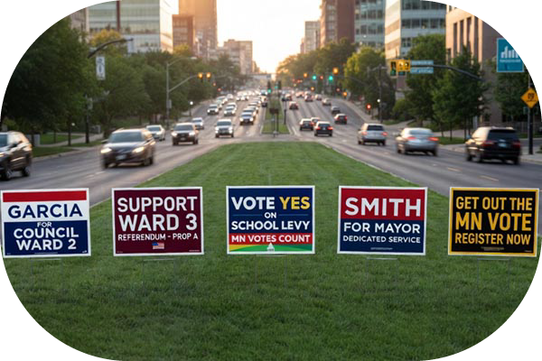 Winning over Minnesota voters requires an undeniable, ground-level physical presence. Staking custom political signs at high-traffic intersections along University Avenue or proudly lining the manicured lawns of dedicated supporters in neighborhoods like Linden Hills and Highland Park builds critical, unavoidable name recognition. By turning neighborhood sidewalks, snowy medians, and front yards into your 24/7 advertising network, you create a tangible grassroots momentum that cuts through the noise of the political machine.