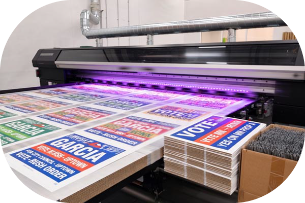 - Digital Printing: When your race requires striking full-color candidate portraits or just a smaller batch of cheap yard signs, we utilize state-of-the-art Durst digital presses. This process cures the ink directly onto the plastic yard signs, delivering a crisp, glare-free matte finish.