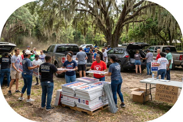 A faded or drooping "vote for" sign reflects poorly on a candidate. Your campaign advertising needs to project strength and endure the unpredictable Florida weather, from blistering humidity and heavy summer downpours to intense sunshine, all the way to Election Day. We manufacture our durable campaign yard signs using rugged materials and premium UV-resistant inks. This guarantees your political yard signs remain bold, legible, and firmly planted on their H-stakes, regardless of what the Tallahassee climate throws at them.